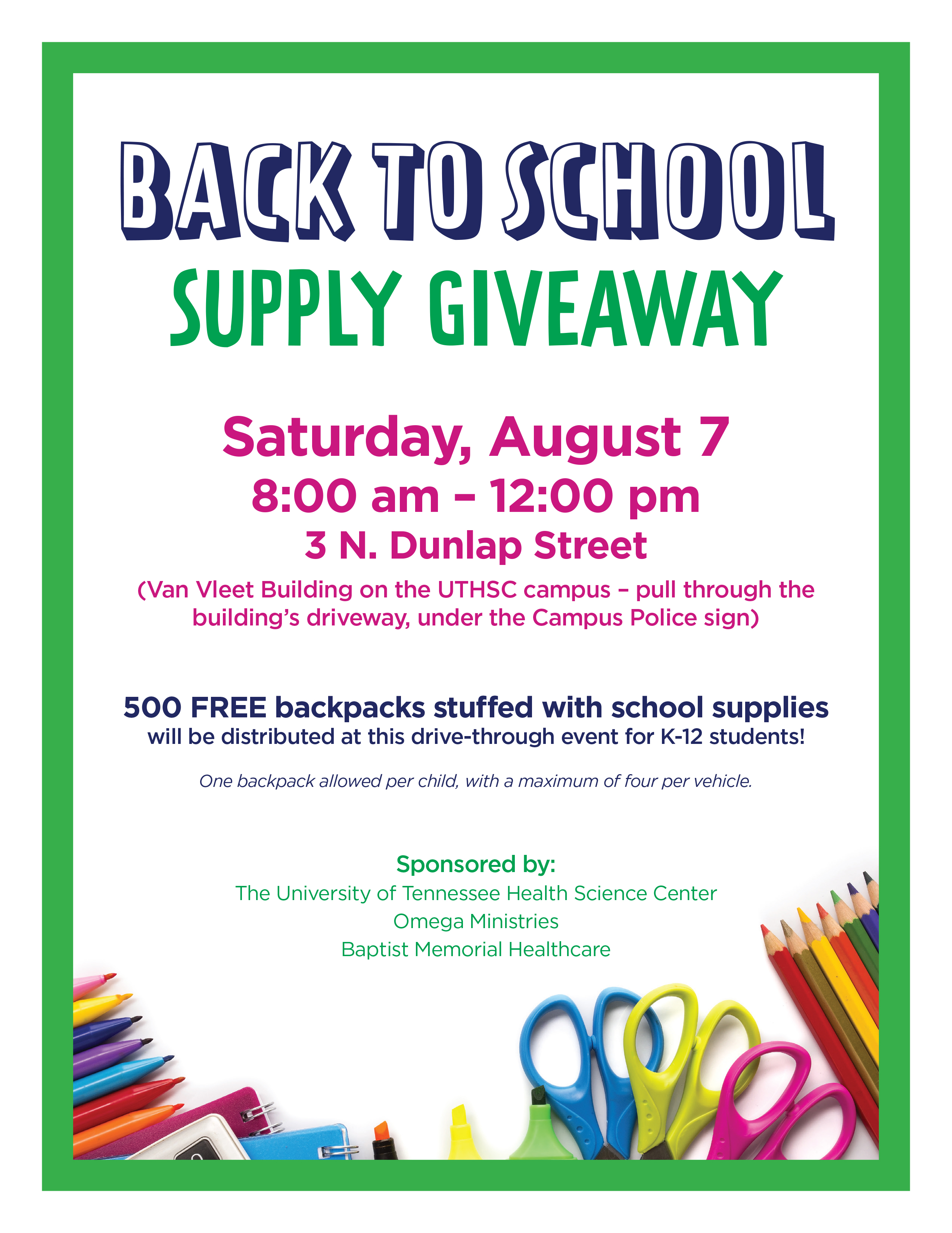 The drive-through event will be held on the UTHSC campus from 8 a.m. to noon at the Van Vleet Building, 3 N. Dunlap. Attendees should enter the driveway off of Dunlap. Backpack distribution is limited to one per child, with a limit of four children per car.